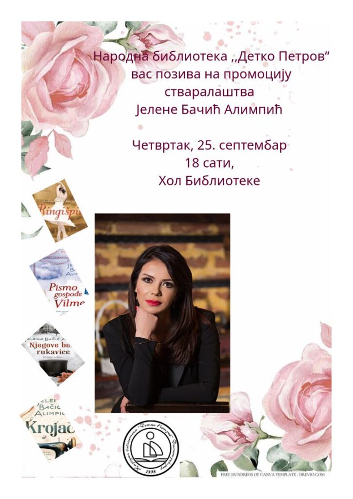 Народна библиотека “Детко Петров” у четвртак организује књижевно вече са Јеленом Бачић Алимпић. Уредница културно-јавне издавачке делатности библиотеке, Драгана Пешаковић је у радио-емисији од пола 10, позвала све заинтересоване да дођу у четвртак у библиотеку и упознају се са стваралаштвом ове ауторке.